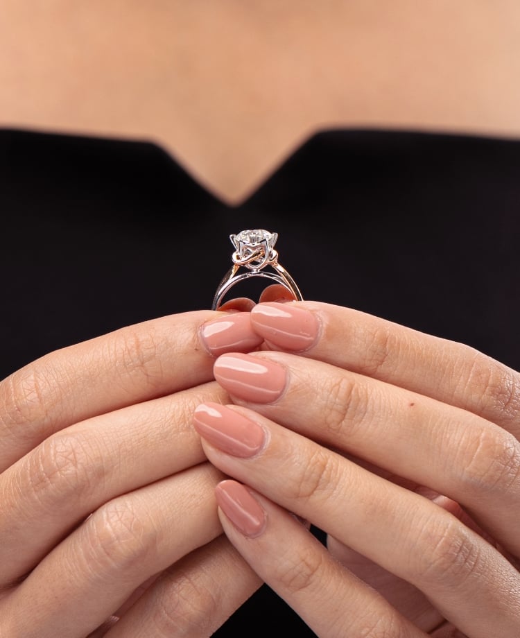 You know it is not a run-of-the-mill design with gentle curves and a subtle white gold accent on the band. For even more impact, pair it with a beautiful rose-gold diamond bracelet to complete the look. With this ring, you are also doing a favour to the environment and mining community by owning a lab-grown diamond, a win-win situation for all!
