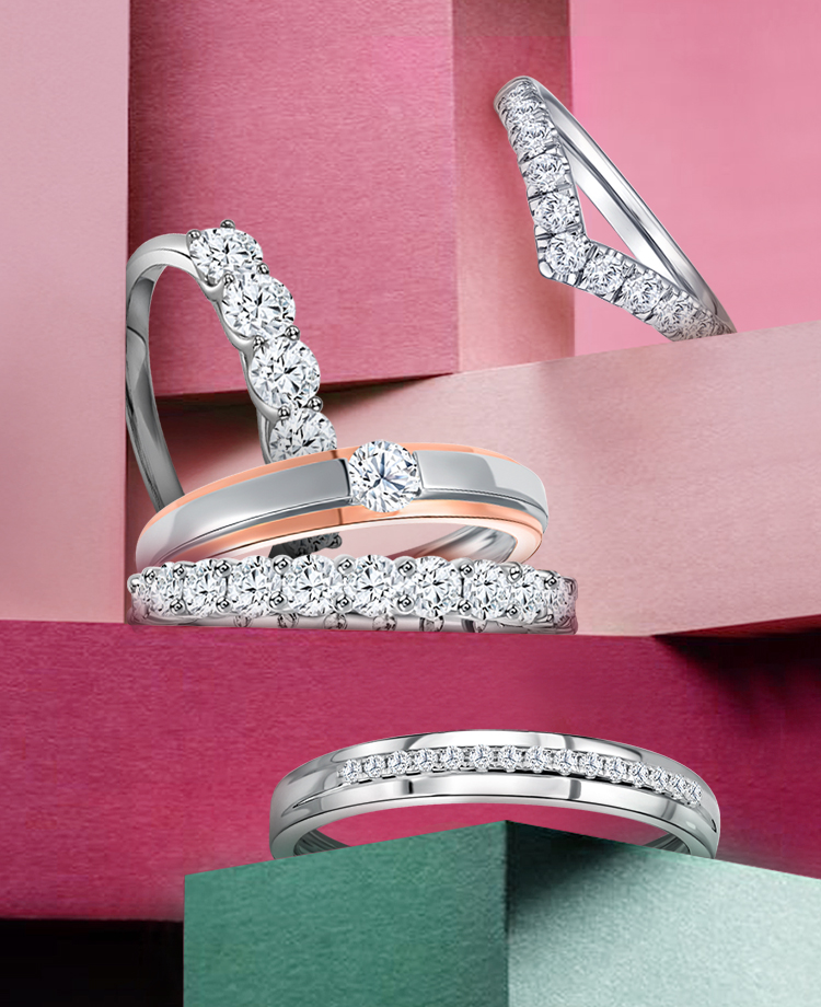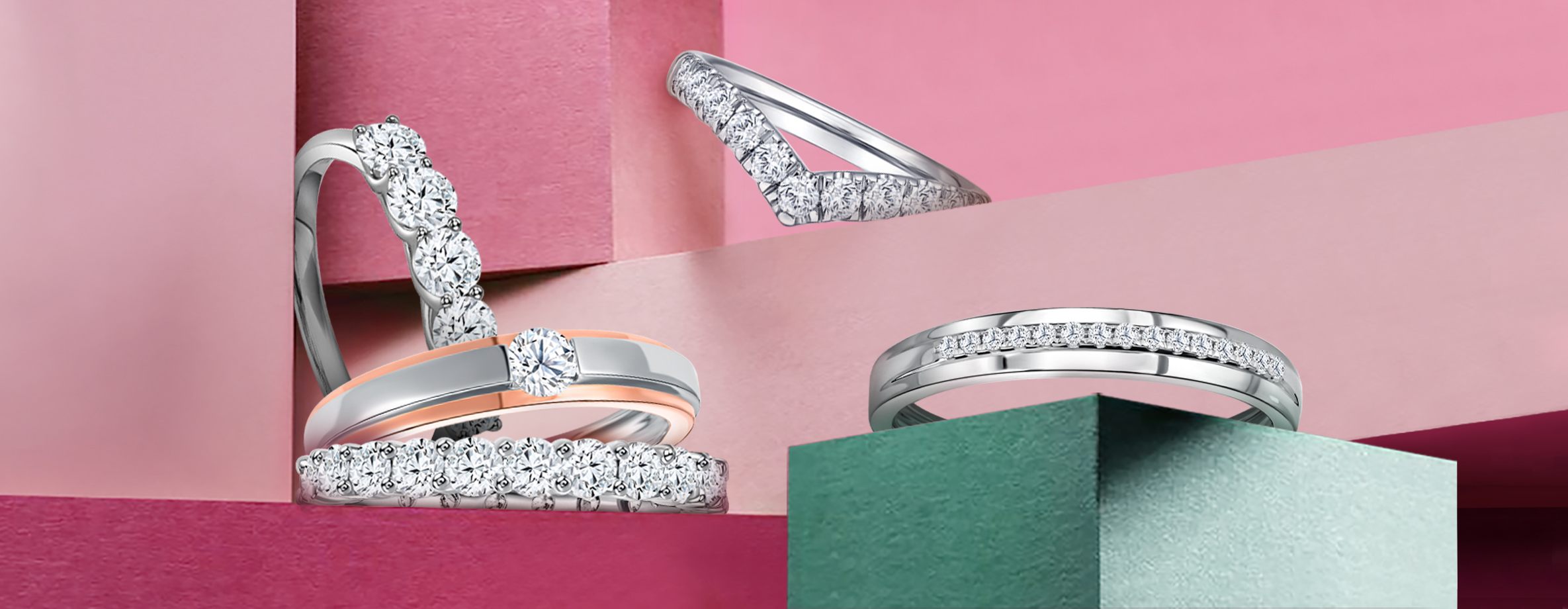 Combine thinner and wider bands to create a balanced yet eye-catching stack. Thinner eternity bands can enhance the brilliance of a thicker, bolder centrepiece ring.