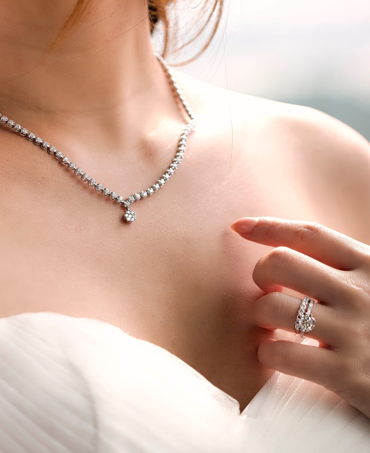 Alternatively, consider picking a dress with a flowy mermaid silhouette and soft sheen if you have a timeless, understated solitaire ring. For a sleek appearance, a silky sheath dress would look stunning. Most brides who wear solitaire engagement rings go for simple wedding outfits, but if you want to up the ante a bit, consider subtle details like pearl straps or sparkly jewellery pieces from Love & Co.'s wedding jewellery collection in Singapore.