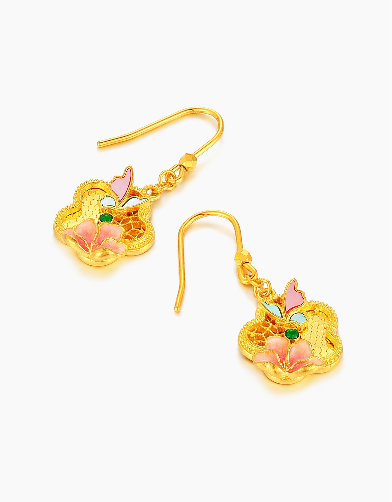 Butterflies with mother-of-pearl inlay flutter above a sparkling salmon-pink enamel flower, swaying gracefully with movement. Crafted in 999 gold, they embody timeless elegance and vibrant cultural charm.