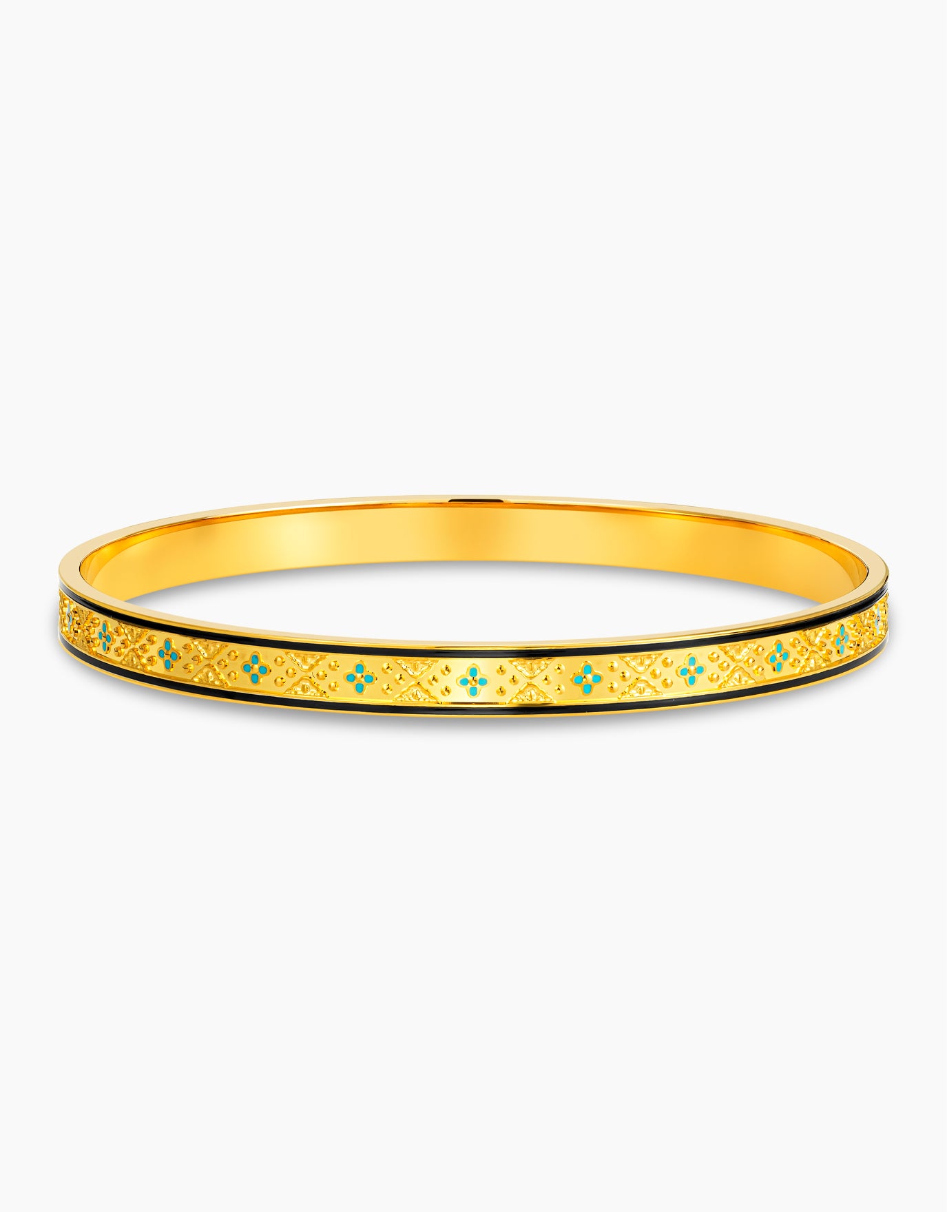 A glossy gold bangle edged with twin black enamel lines and accented four-leaf clovers, dotted with robin egg blue enamel for a vibrant pop of colour. A joyful symbol of luck, perfect for gifting or collecting.