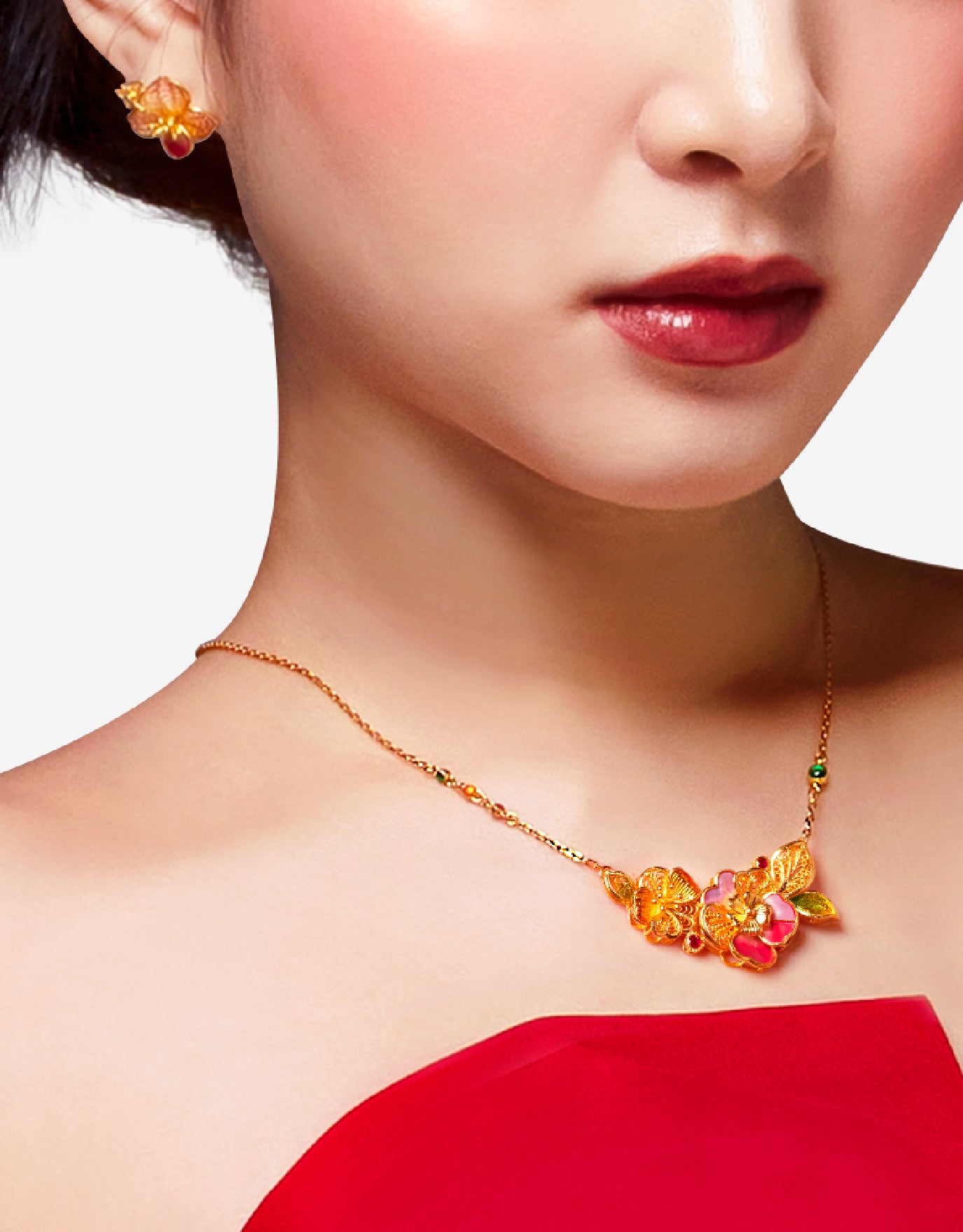 Symbolic floral forms bloom in ornate filigree, highlighted by vivid enamel accents and radiant mother-of-pearl inlay. Created using traditional goldsmithing techniques, this piece honours cultural legacy with artistry and joy.